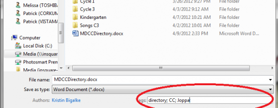 - Taking advantage of tags. This is probably Windows’ best kept secret. I think it’s a feature starting in Vista. Even though folders are great things, sometimes it’s hard to decided which folder it fits into. For example, I might have a great history resource that is also a great Classical Conversations resource. I could put it in both folders but that is a waste of space. OR I could decide which folder it primarily fits and tag it with the other label. Tags are simply words that are associated with the file that will help you find it later. You can add a tag when you save it as highlighted below or right click the file at any time and add tags in the Details tab of the Properties dialogue box. This will work for any file in the Office Suite (e.g., .docx, .xlsx, .pptx) or a .jpg. To search for files tagged with a specific word, click the START button and type your search term into the field that says “Search programs and files.” You may have to click “See more results” to see the files with your tag.