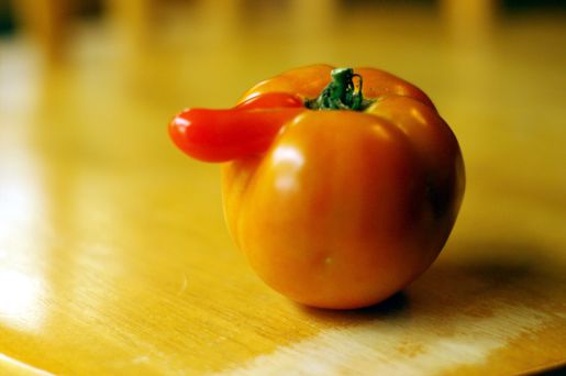 **And the winner is “A Gene Simmons GMO.” It made us laugh out loud.** I couldn’t resist. This tomato out of our garden screamed, “Make me a name-that-photo!” Best caption (comment with your entry) wins a copy of CollageIt Pro. Entries will be accepted through Friday.