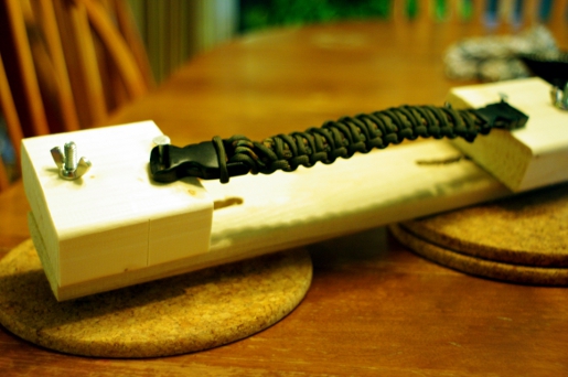 PJ’s been making these really cool paracord survival bracelets. He even built this contraption to help him make them more easily.