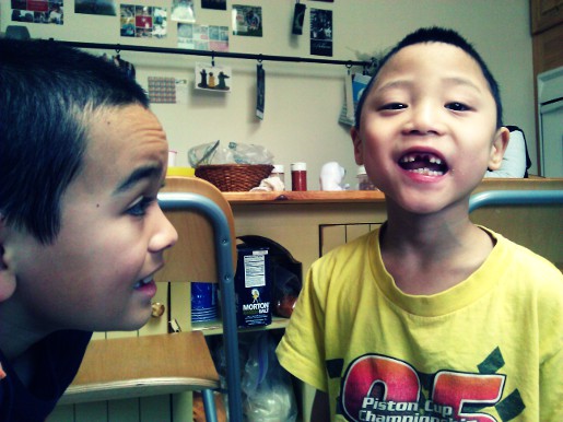 Apparently Ty loses teeth in pairs. The bottom two came out at the same time, and now the top two are gone within seconds of each other (and a little help from Daddy). It’s really hard to take him seriously now 🙂