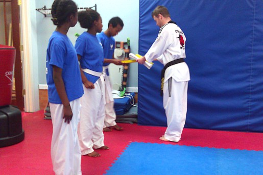 Patrick and I are now blue belts, Kayla and John are yellow belts, and Grace received her first belt…white.