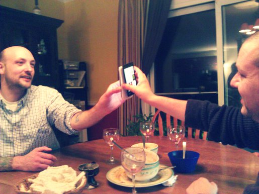 The things boys will do for technology. Can you say “tap-n-send”?