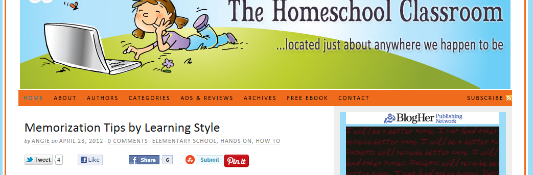I’ve been published! The folks over at the Homeschool Classroom posted an article today about memorization tips and learning style written by yours truly. Head over there by clicking here to get some tips and show some love.